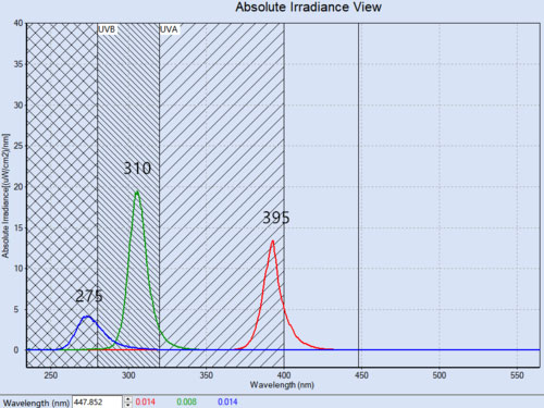 Spectral irradiance measurement is based on a light irradiance meter with a linear image sensor, making it possible to simultaneously measure light irradiance over a wide spectral range like a spectrometer. Usually, depending on the detector, it is divided into UV-biased and NIR-biased bands. It also retains the features associated with light irradiance meters, with NIST traceability calibration and the ability to connect input optics such as optical fibers and integrating spheres. Also with powerful analysis software, the spectrum, light irradiance, luminous flux and other values can be analyzed and measured.